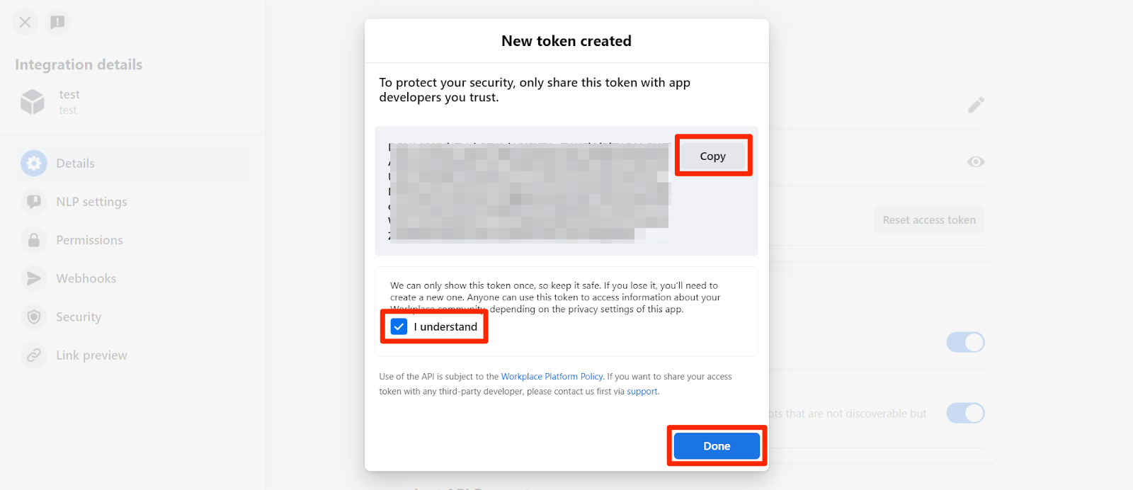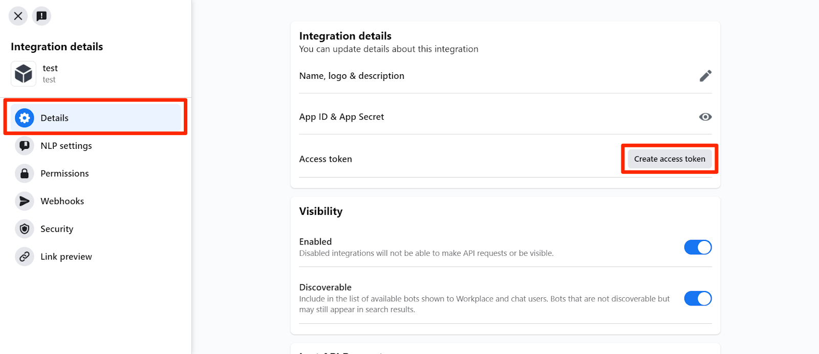 作成されたcustom integrationにて左サイドバーの『Details』から『Create access token』ボタンを押下します。