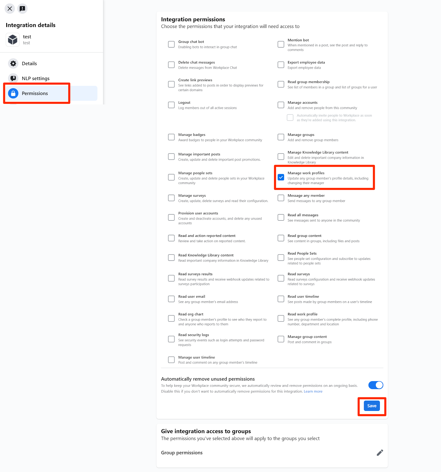 custom integrationにて左サイドバーの『Permissions(アクセス許可)』から『Manage work profiles』にチェックを入れ『Save(保存)』ボタンを押下します。