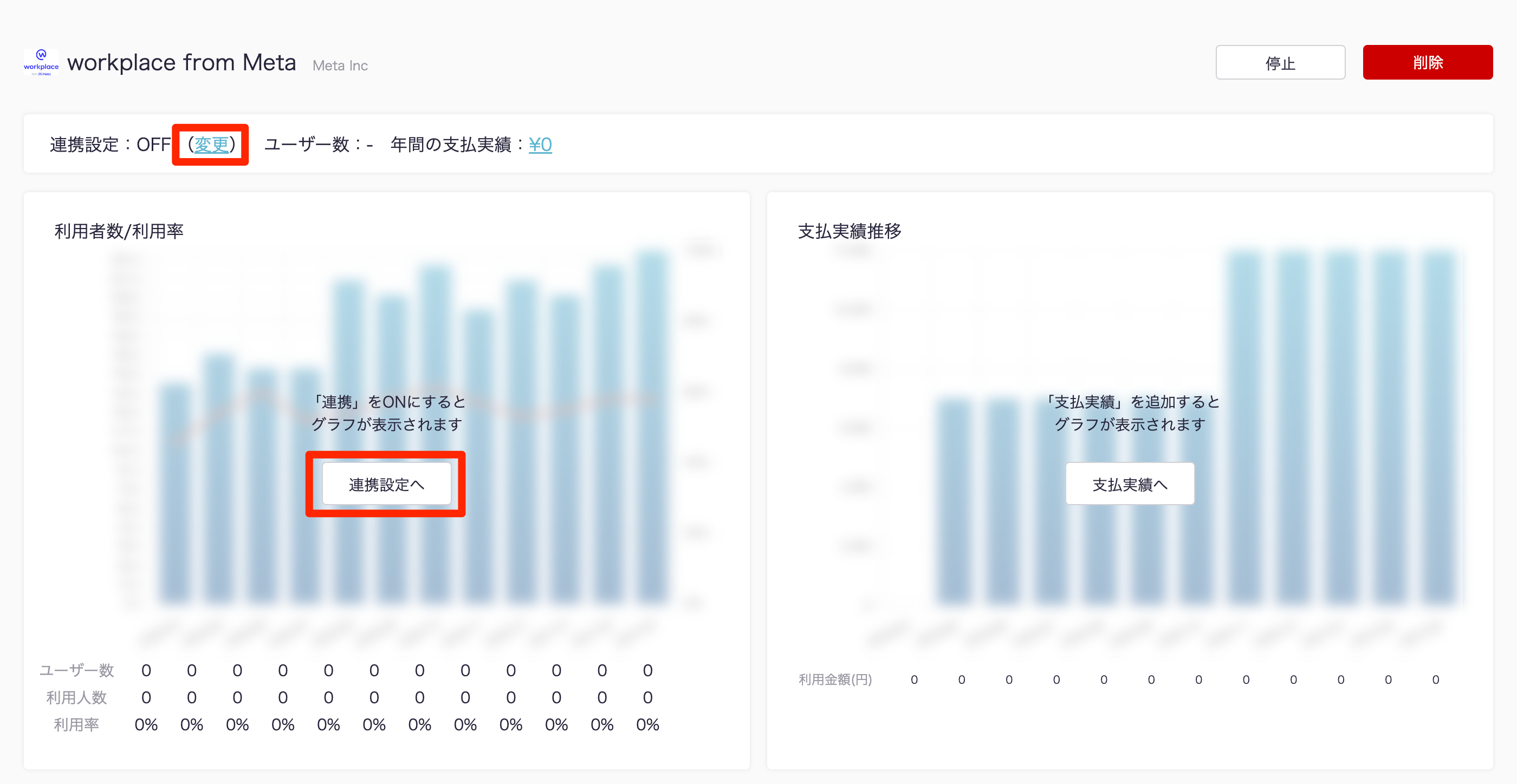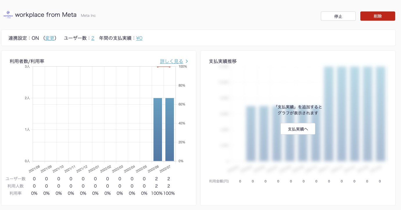 ITboardのサービス詳細画面に戻りますので、そこで「連携設定: ON」になり、「利用者数/利用率」のグラフが見られるようになっていれば、連携成功です。