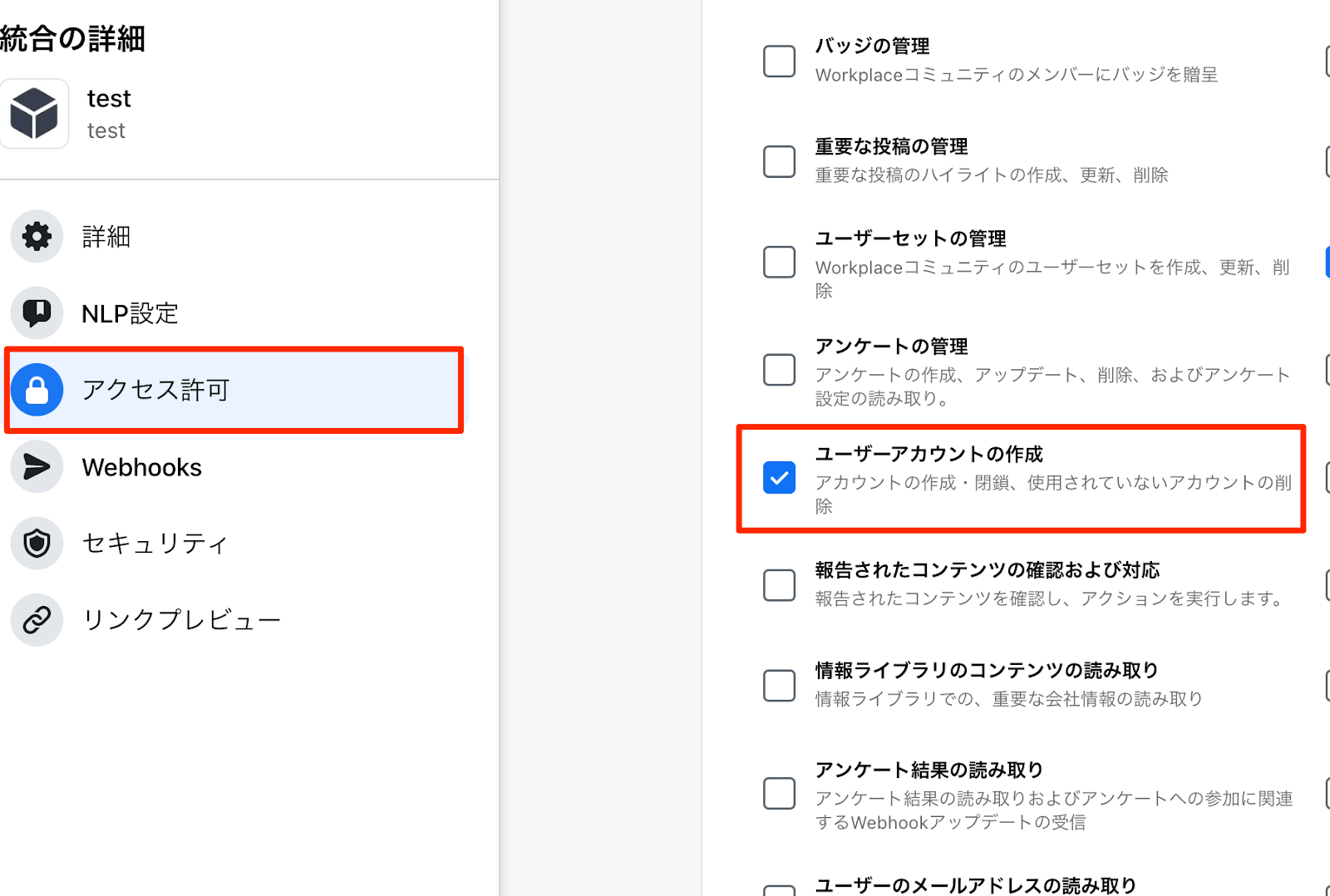 custom integrationにて左サイドバーの『アクセス許可』から『ユーザーアカウントの作成』にチェックを入れ『保存』ボタンを押下します。