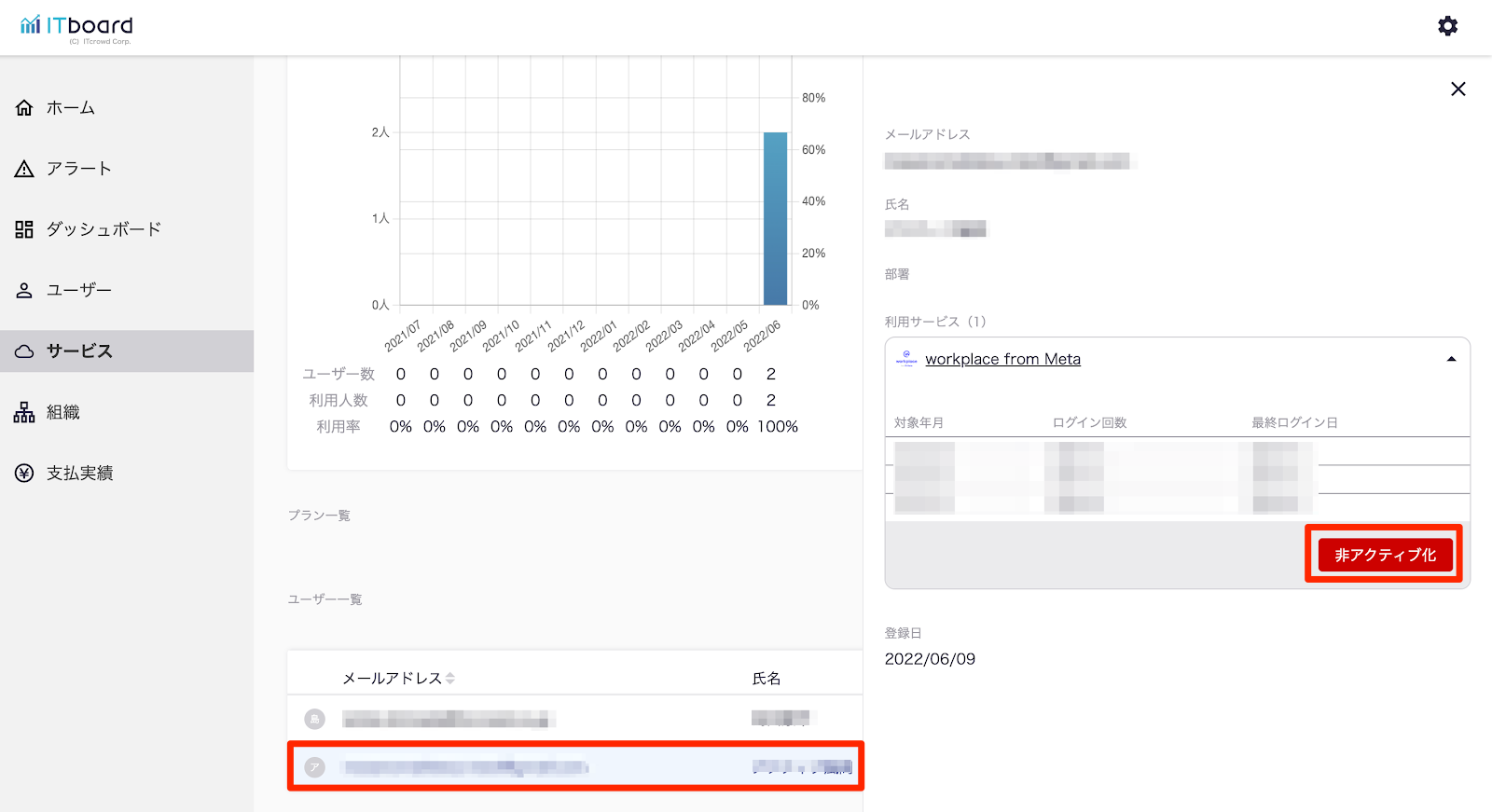 ITboard上の『ユーザー一覧』で非アクティブ化したいユーザーを選択し、『非アクティブ化』ボタンを押下します。