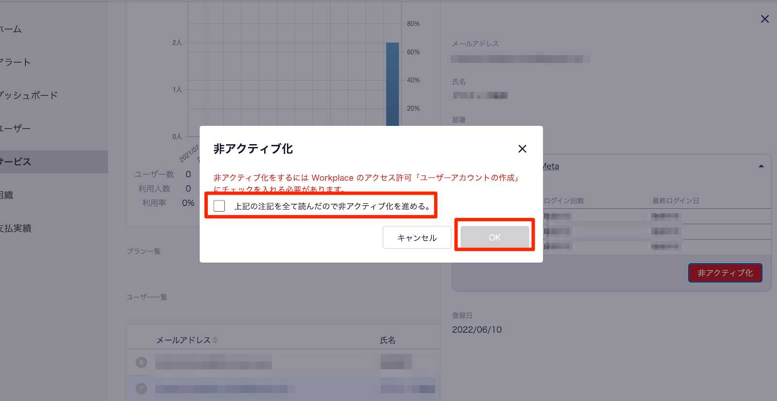 するとモーダルが出現するので、チェックボックスにチェックを入れ『OK』ボタンを押下します。ITBorad上からユーザーが消えたら、非アクティブ化成功です。