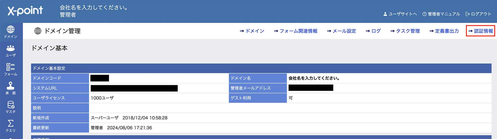 ※「ドメインコード」は「1.X-point Cloudにログインしドメインコードを取得する」でコピーした「ドメインコード」を入力してください。