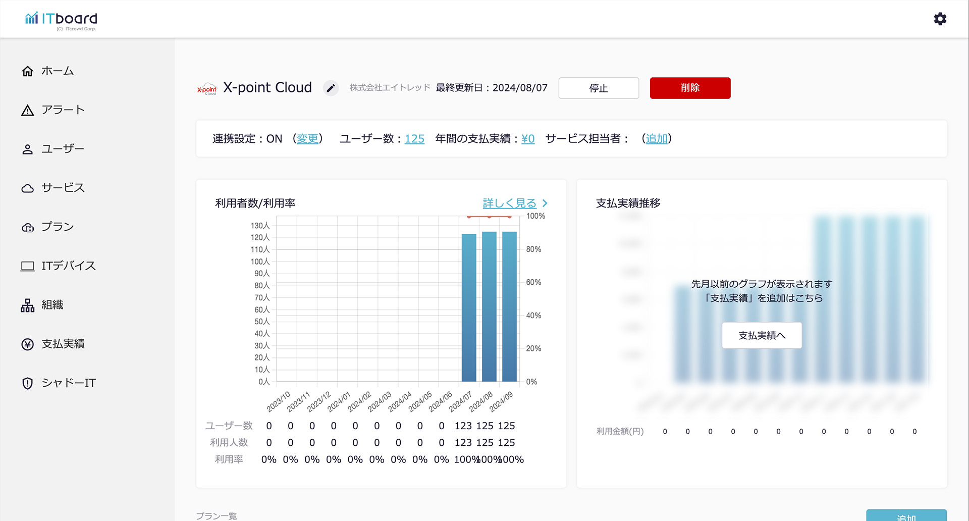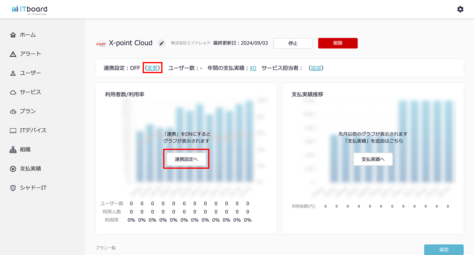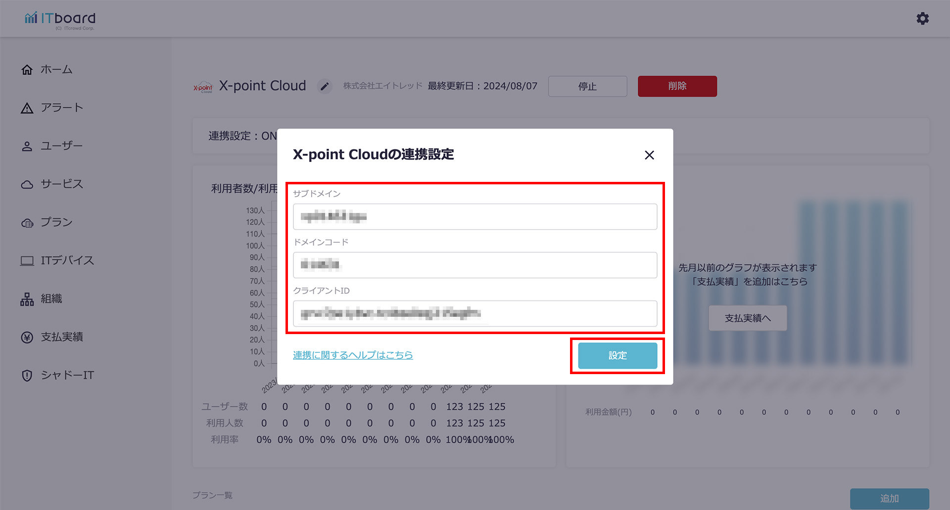 ITboardのサービス詳細画面に戻りますので、そこで「連携設定: ON」になり、「利用者数/利用率」のグラフが見られるようになっていれば、連携成功です。