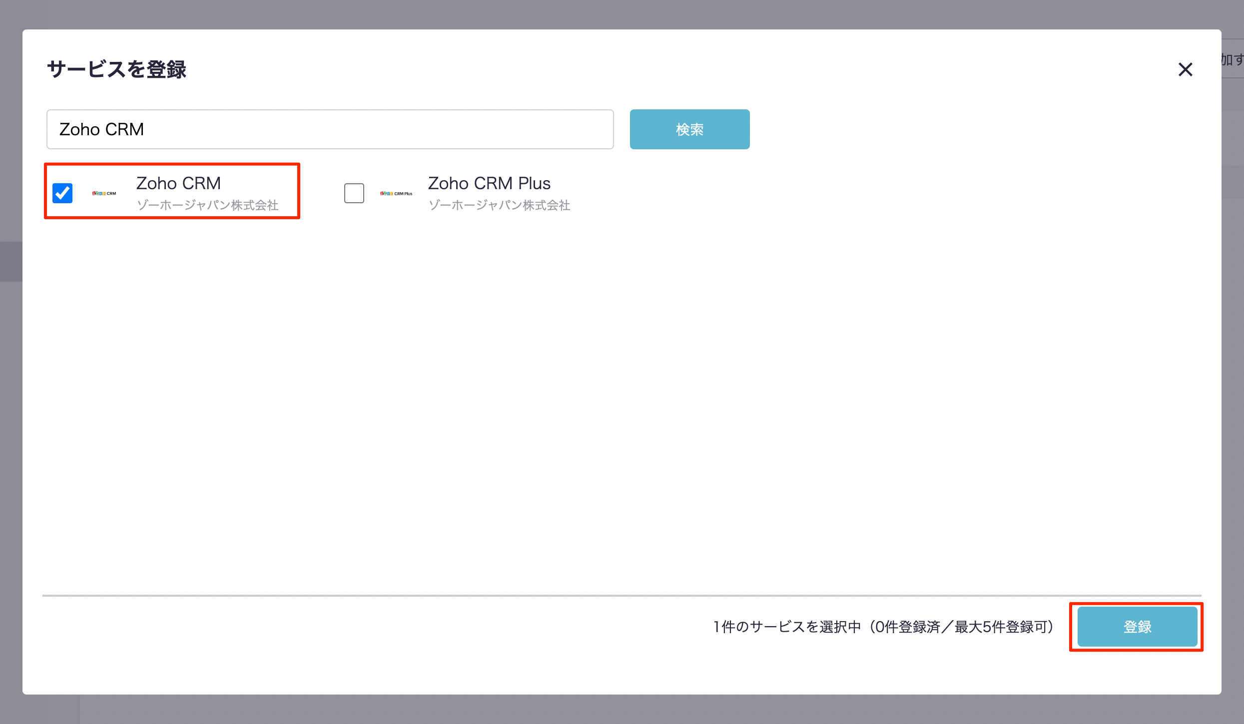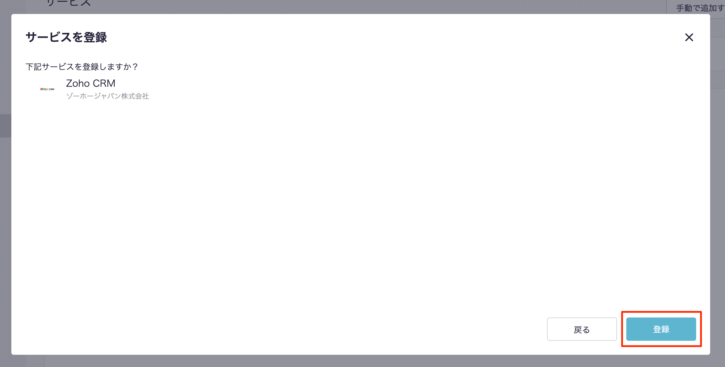 その後、下画像のようなモーダルが出現しますので、入力欄にサービス名である「Zoho CRM」と入力します。