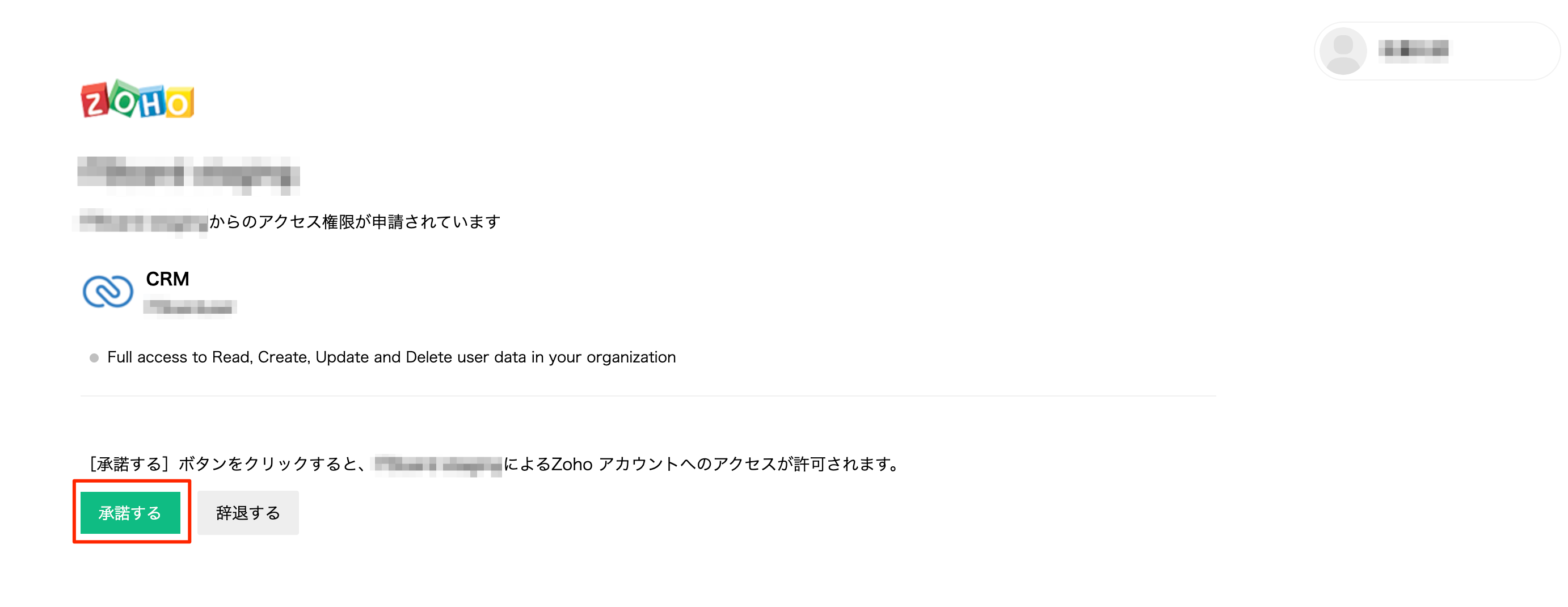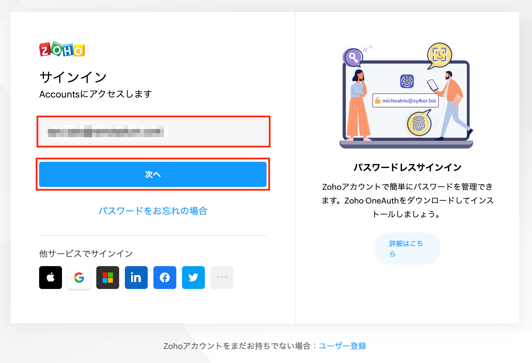 するとZoho CRMの画面へ遷移するので、Zoho CRMにサインインします。