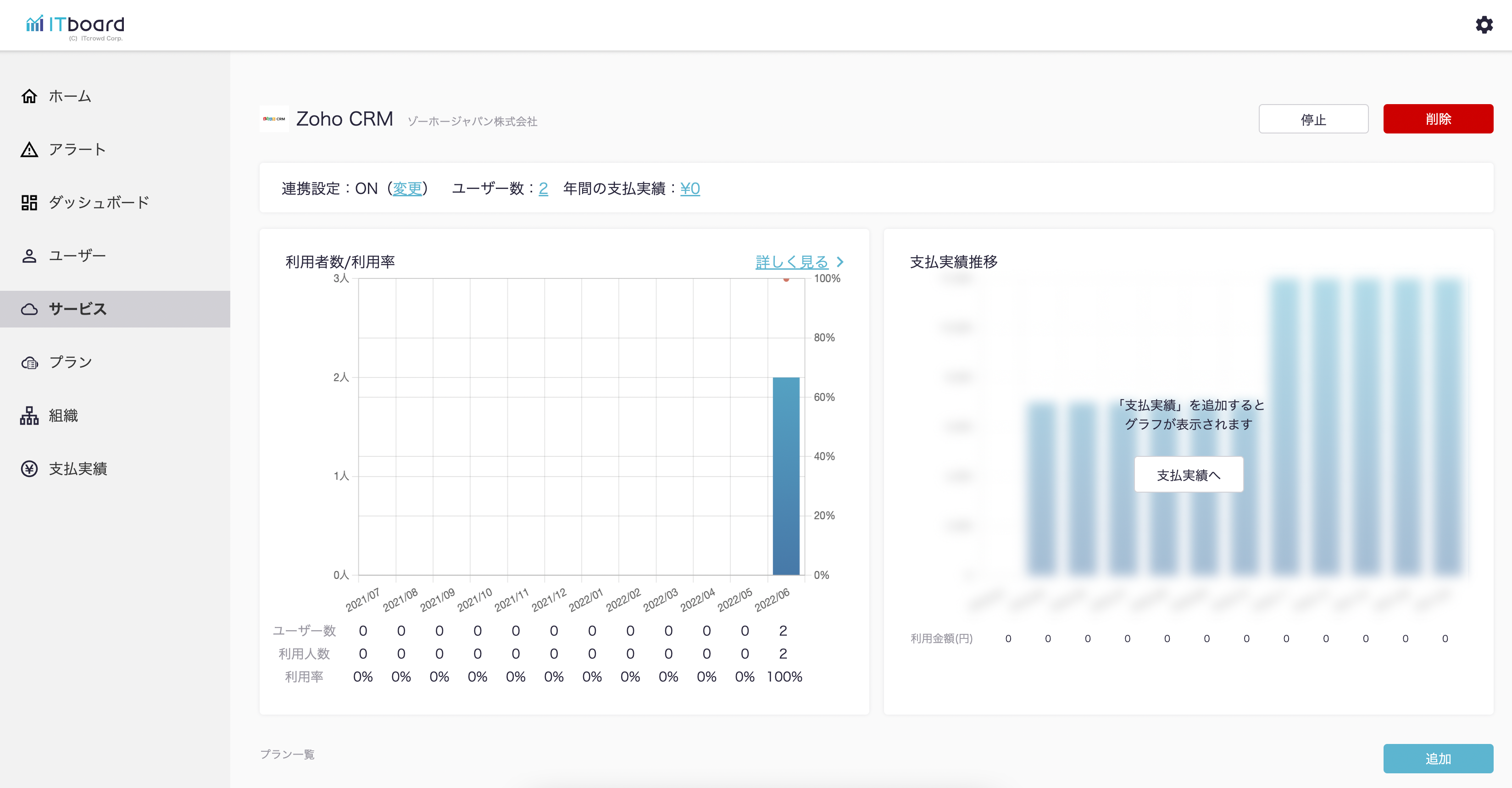 ITboardのサービス詳細画面に戻りますので、そこで「連携設定: ON」になり、「利用者数/利用率」のグラフが見られるようになっていれば、連携成功です。