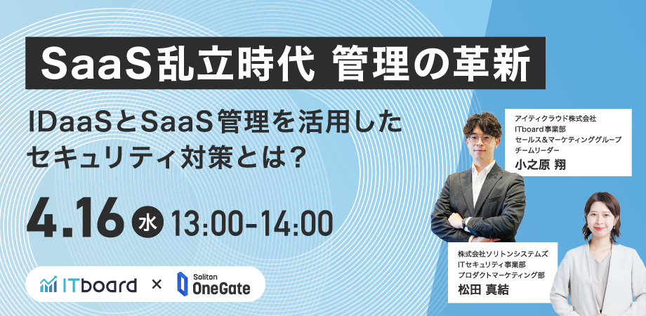 本セミナーでは、IDaaS「Soliton OneGate」とSaaS管理「ITboard」を活用して、セキュリティ対策を強化する方法を合わせてご紹介します。